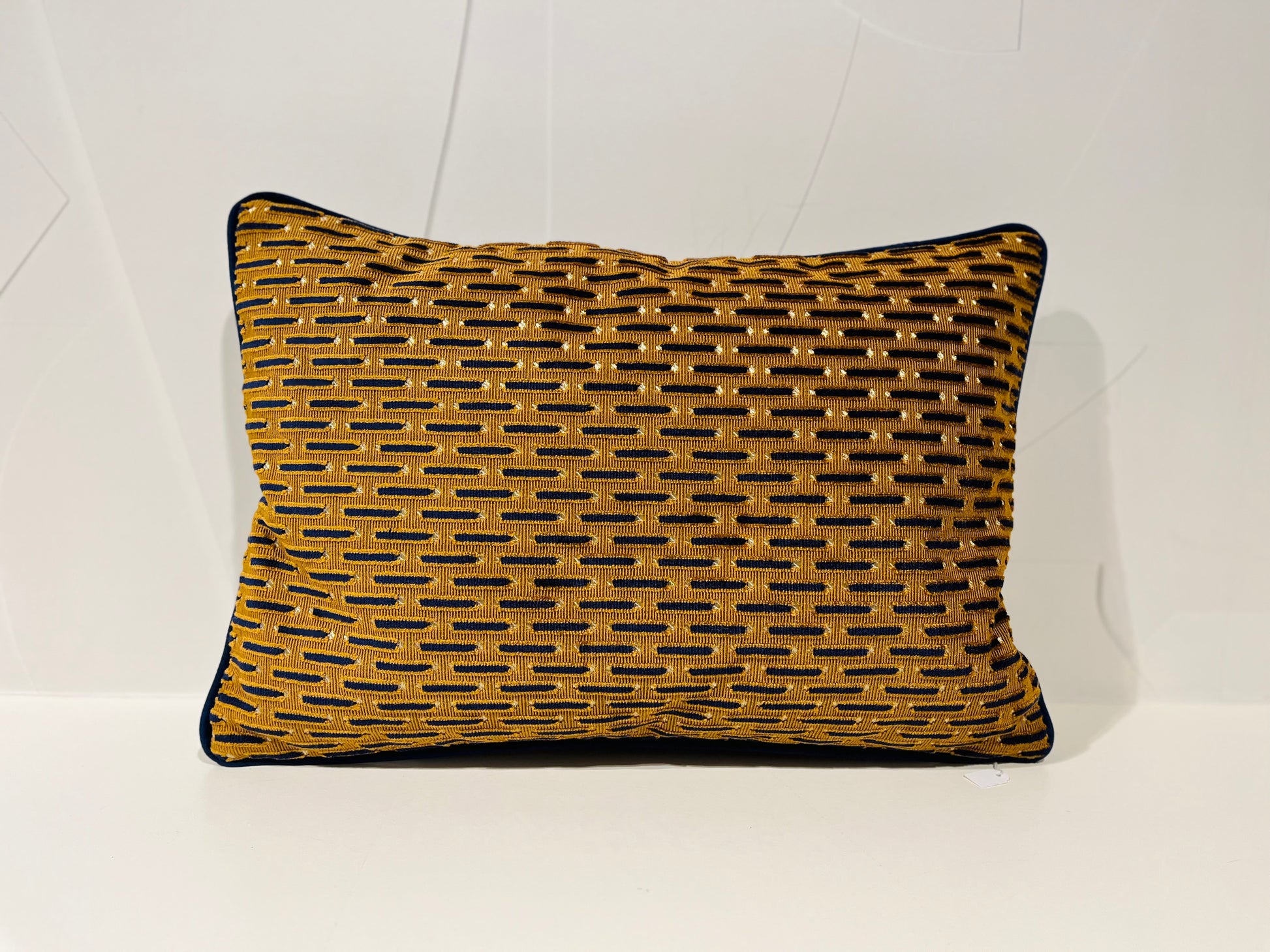 Decoratieve stof okergeel met blauwe tekening. Keerzijde in blauw fluweel